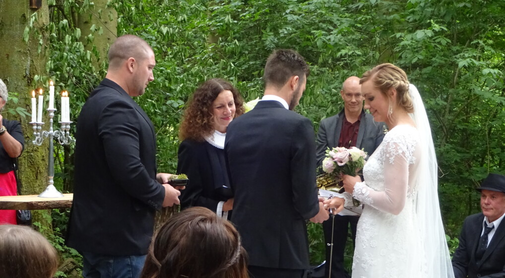 Maja og Thomas blev kirkeligt velsignet i skovkanten af sognepræst Pernille Hornum. Privatfoto. Se flere fotos fra brylluppet i længere nede.