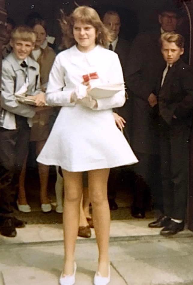 - Konfirmation i Redsted Kirke på Mors 1970. Jeg sov ikke hele natten, fordi jeg havde min mors stikkende papillotter i, så min page kunne bukke fint. Kan se jeg også har hvide handsker på, det har jeg dog ingen erindring om. Kjolen kan vel næppe blive mere lårkort.