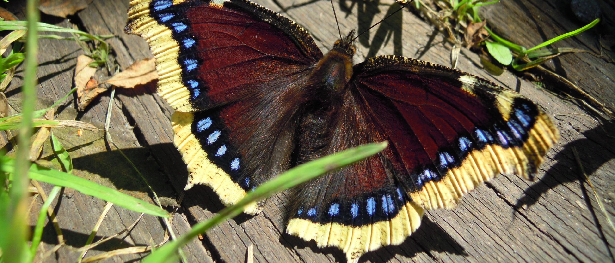Sommerfuglen Sørgekåbe er dybviolet med klare blå prikker og en lys gul yderste kant. ”Men,” skriver Mikkel Frey Damgaard, ”de blå pletter og den gule kant vidner også om, at der findes noget andet under kåben.”
