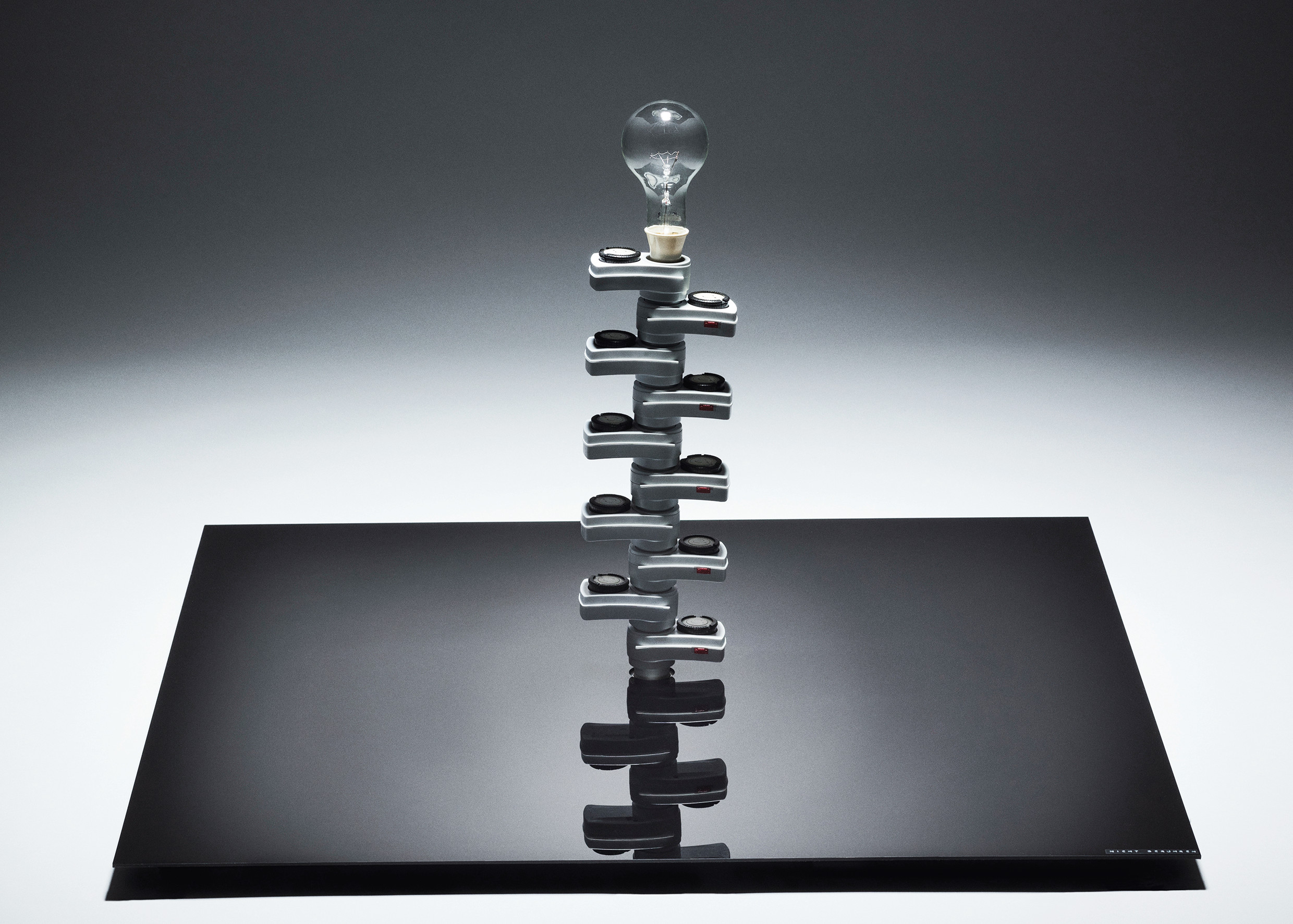 På gulvet ligger et blankpoleret sort kvadrat, hvor op af der rejser sig en mærkværdig, skulpturel form bestående af ti el-timere sat sammen i række og med en glødepære for enden.
